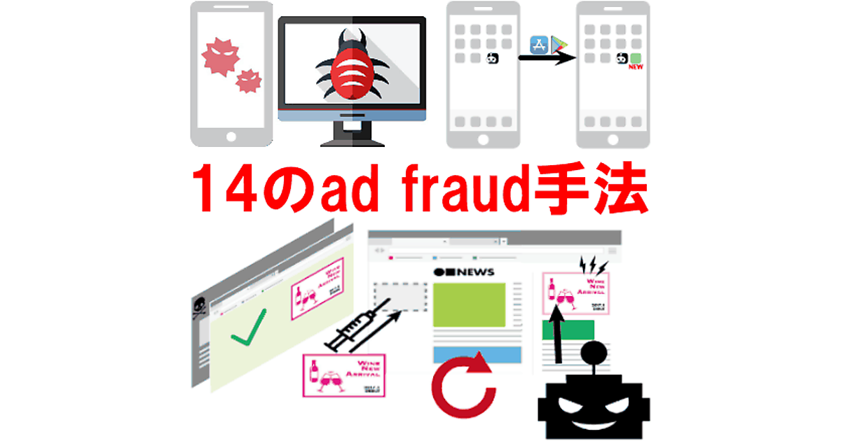 実際には何の成果もないのに「広告が表示された・クリックされた」と広告配信システム上はレポートされる状態を作り出す、悪意をもったアドフラウドの手法を14種類、整理して解説する。