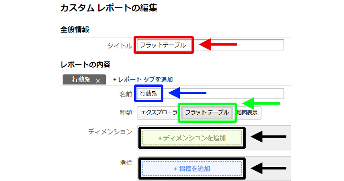 まずは前回同様に「カスタム」セクションの「カスタム レポート」からカスタムレポートの新規作成画面を表示する。そこでレポートタイトル名(図3赤枠部分)と、レポートタブ名(図3青枠部分)を適切に記入したうえで、「種類」で「フラットテーブル」を選択しよう(図3緑枠部分)。