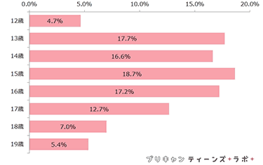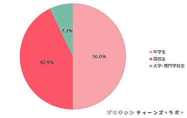 回答者の年齢は、13歳~16歳がボリュームゾーンとなり、属性別では「中学生(50.0%)」が半数、「高校生(42.9%)」が約4割。