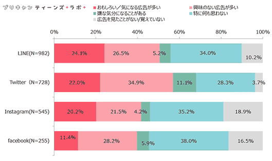 一方、LINE、Twitter、Instagramについては、2割以上の子が「おもしろい/気になる広告が多い(LINE:24.1%、Twitter:22.0%、Instagram:20.2%)」と回答。