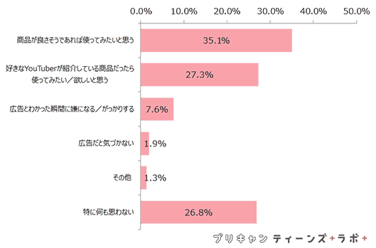 「YouTuberの商品紹介動画に対する印象」を尋ねたところ、「商品が良さそうであれば使ってみたいと思う(35.1%)」が最多となり、「好きなYouTuberが紹介している商品だったら使ってみたい/欲しいと思う(27.3%)」が続いた。