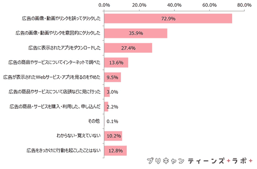 「スマホ広告」を見た時の行動については、「広告の画像・動画やリンクを誤ってクリックした(72.9%)」が突出する結果に。次いで「広告の画像・動画やリンクを意図的にクリックした(35.9%)」、「広告に表示されたアプリをダウンロードした(27.4%)」と続く。
