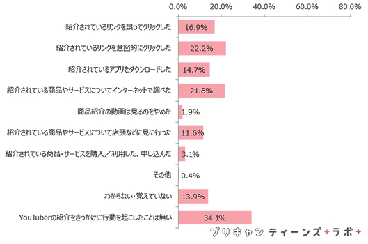 「YouTuberの商品紹介動画」についても同様の質問をしたところ、「YouTuberの紹介をきっかけに行動を起こしたことはない(34.1%)」が最多。