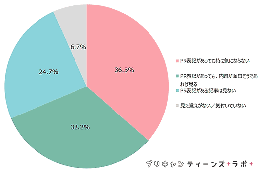 また、「知っている」と回答した人に「PR/AD表記のある記事についてどう思うか」を聞いたところ、「特に気にならない(36.5%)」、「内容がおもしろそうであれば見る(32.2%)」という結果になり、「PR表記のある記事は見ない(24.7%)」という回答者を上回った。