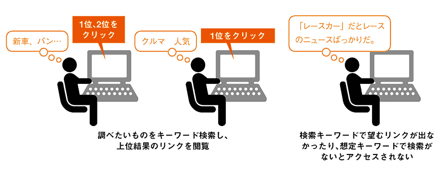 消費者は「知りたい」「調べたい」と思ったときに検索エンジンを使い、そのとき検索エンジンが示した検索結果の中から、自分の探しているものに一番近そうな記事のリンクを選択します。