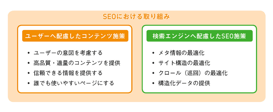そこでオウンドメディア運営側が取り組むべきは、消費者にとって「価値のあるコンテンツ」をまず用意することです。その上で検索エンジンが適切に内容を認識できるように、サイトを整備する必要があります。