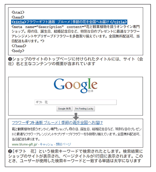 HTMLで指定するページタイトル文は、そのまま消費者に対してのメッセージやオファーになります。決しておろそかにしてはいけない文であるということがわかるでしょう。