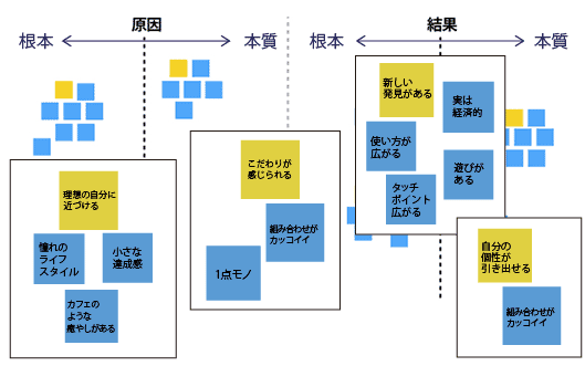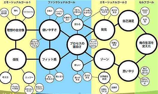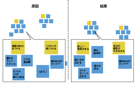 私たちのこれまでの経験上、多くの場合、左端(より気軽な原因)には「見た目が好き」「持った感じが丁度良い」など初回のタッチポイントにおける印象がきます。そして右端(より本質的な結果)には「自己肯定感が増す」「前向きな気持ちになる」など、個人の気持ちに影響を及ぼすものが多くなります。