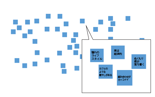 たとえば、キーワードグループに「作り手のこだわりが感じられる」「個性が際立つ」などのグループ名がある場合、「作り手のこだわりが感じられる」から「個性が際立つ」という因果関係が見られます。その場合は「作り手のこだわりが感じられる」を左側の原因エリアに、「個性が際立つ」を右側の結果エリアに配置してください。