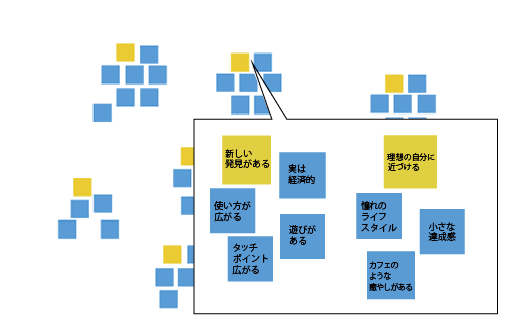 グループ名(黄色のポストイット)を大きめに書いて、それに付随するキーワードは小さく書きます。