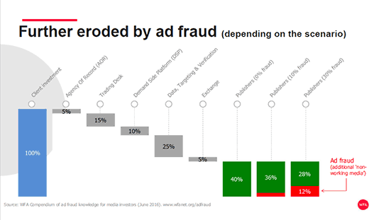 にもかかわらず、広告主が支払う広告費のうち、代理店やプラットフォームに60%も消えていき、コンテンツの作り手であるパブリッシャー(メディア)には40%しか残りません。さらにそこから、アドフラウドなどで12%消え、最終的にパブリッシャーに28%しかお金が残らない状況になっていると、2016年のWFAの調査で明らかになっています。