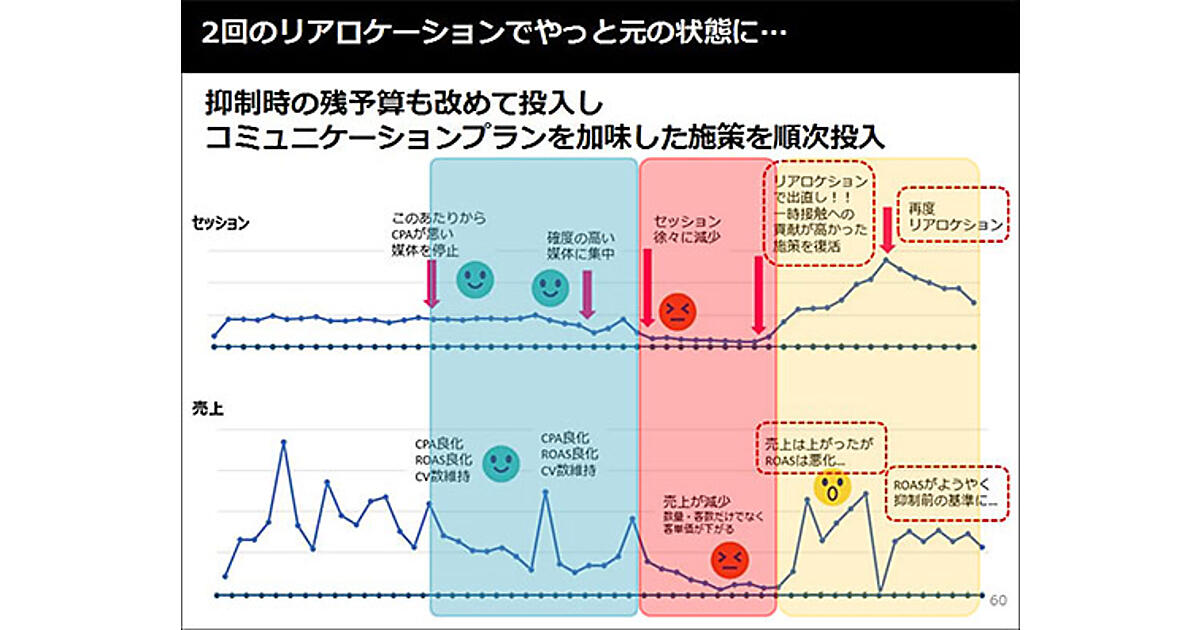 施策としては、広告費をどのように使うかの配分変更(リアロケーション)をやり直し、改善していきました。