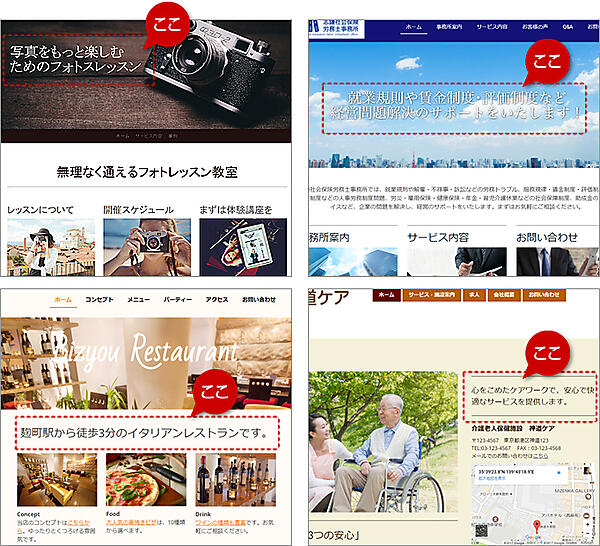 サービスを終了しましたの中で解説した、個別の各ページ内で一番上に配置している短い文章も、キャッチコピーです。