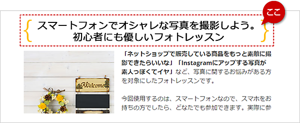 パソコン教室の事例を参考に、短い文章で「メリット」や「特徴」などを表現します。これでキャッチコピーの完成です。可能であれば、いくつかパターンを作っておくことをおすすめします。