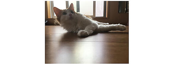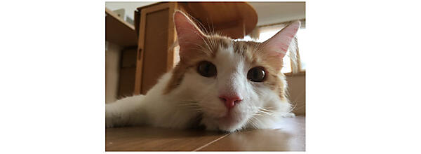 レンズが下になるように構えたことで、目線が下に。普段見られない猫ちゃんのアングルですね。