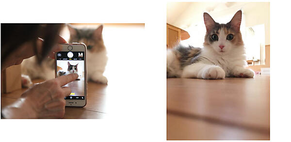 スマホカメラは広角レンズが採用されているので、近くによって撮影すると、周辺がゆがんだ写真になります。猫ちゃんの顔を歪ませず、アップでスタイルよく撮影したい!という場合には望遠レンズを使用してみるのがお勧めです。