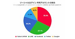 その結果、Yahoo! JAPANのアカウントの割合が32.5%で最多。続いてLINEが27.1%、Facebookは20.3%、Twitterは11.9%、Google+が8.2%。