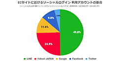 5種類のソーシャルログインをすべて実装しているサイトに限定し、2017年12月~2018年1月の2か月間におけるソーシャルログインの利用状況を調査した結果は、LINEが52.3%、Yahoo!J APANは24.3%、Facebookは10.6%、Google+は6.9%、Twitterは5.9%だった。