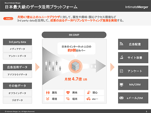 独立系でない場合、「あのメディアには広告配信ができて、このメディアは配信できない」なんてことが起こるんですが、私たちのパブリックDMP(IM-DMP)ではほぼそういったことはないです。