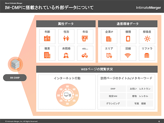 でも、私たちのパブリックDMP(IM-DMP)では、普段お客様が使っているマーケティングツールと繋ぎこんで、目的に合わせて簡単に、細かくカスタマイズできる仕組みをシステム上で提供しています。後、挙げるとするならば「データ活用がフラットな点」でしょうか。