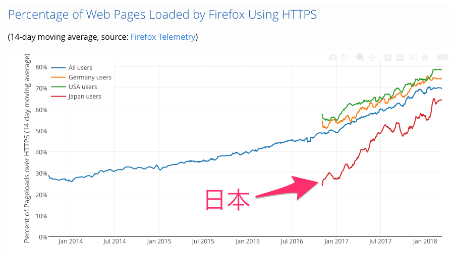 Firefoxブラウザで読み込むウェブページのHTTPS率が、この1年で30ポイント上昇したそうだ。実に、60%以上のページがHTTPSで読み込まれている(他国を含めた全体平均は約70%、米国は約78%、独は74%)。