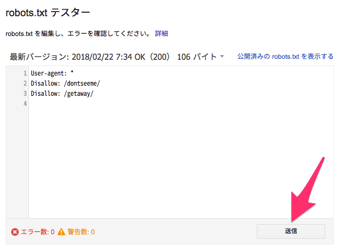 robots.txtの変更を直ちにクロールに反映させたい場合は、Search Consoleの[クロール]>[robots.txtテスター]を利用する。