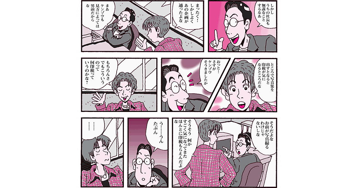 デビュー10周年を迎えて、ますます意気軒昂な著作ケンゾウ君。事務所はその記念イベントとして、ライブのときの写真を写真集として出版しないかという無謀と思える企画を出版社に持ち込んだ。そして大方の予想を裏切り、あっさりとその企画は通ってしまったのである。しかし、写真集の出版は初めてのことなので、どのような契約をすればいいのかわからない。ケンゾウ君は、さっそく、マネージャーをつかまえて訊いてみると……。