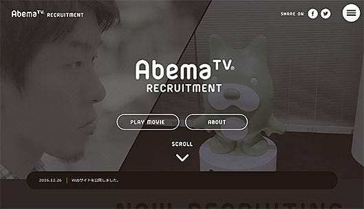 「Abema TV RECRUIT SITE」図1では、本編のムービーから短いクリップを抜き出してループ再生させることで、小さい容量でアイキャッチとなるムービーを作成し、「PLAY MOVIE」から高画質のムービーへと誘導する工夫がされています。また、動画を圧縮させることで画質が粗くなってしまうことへの対策として、動画の上に網掛けレイヤーを配置する配慮がされています。