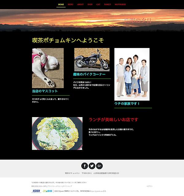 例に出した喫茶店のページ。コンテンツに「ネコ、オートバイ、家族」があるけど、これは趣味だよ。
