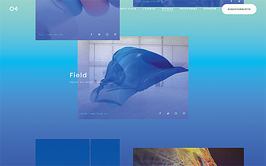 背景グラデーションとスクロールアニメーションも相性が良いため、よく使われています。「Offf Italia」図4は、背景グラデーションとパララックススクロールを組み合わせているので、各イメージ画像が空間内を浮遊しているようなリッチな印象を実現しています。