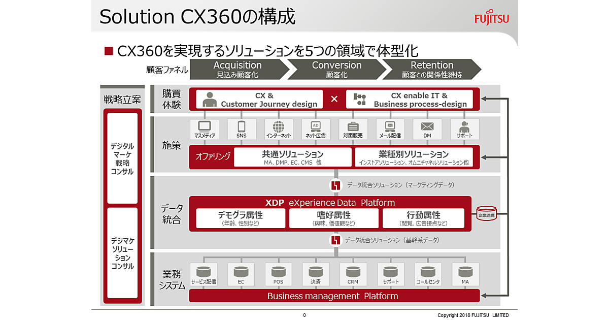 そこで2016年、富士通はデジタルマーケティングに関するコンサルティングから施策実行までのサービスと、それを支える製品・ソリューションを「FUJITSU Digital Marketing Platform CX360(シーエックス360)」として体系化した。