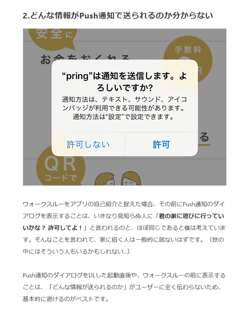 ダウンロード・起動直後にプッシュ通知の許可を求める――ウェブサイトであれば、アクセスした瞬間にプッシュ通知を受け取るかどうかを尋ねてくるパターンに相当する