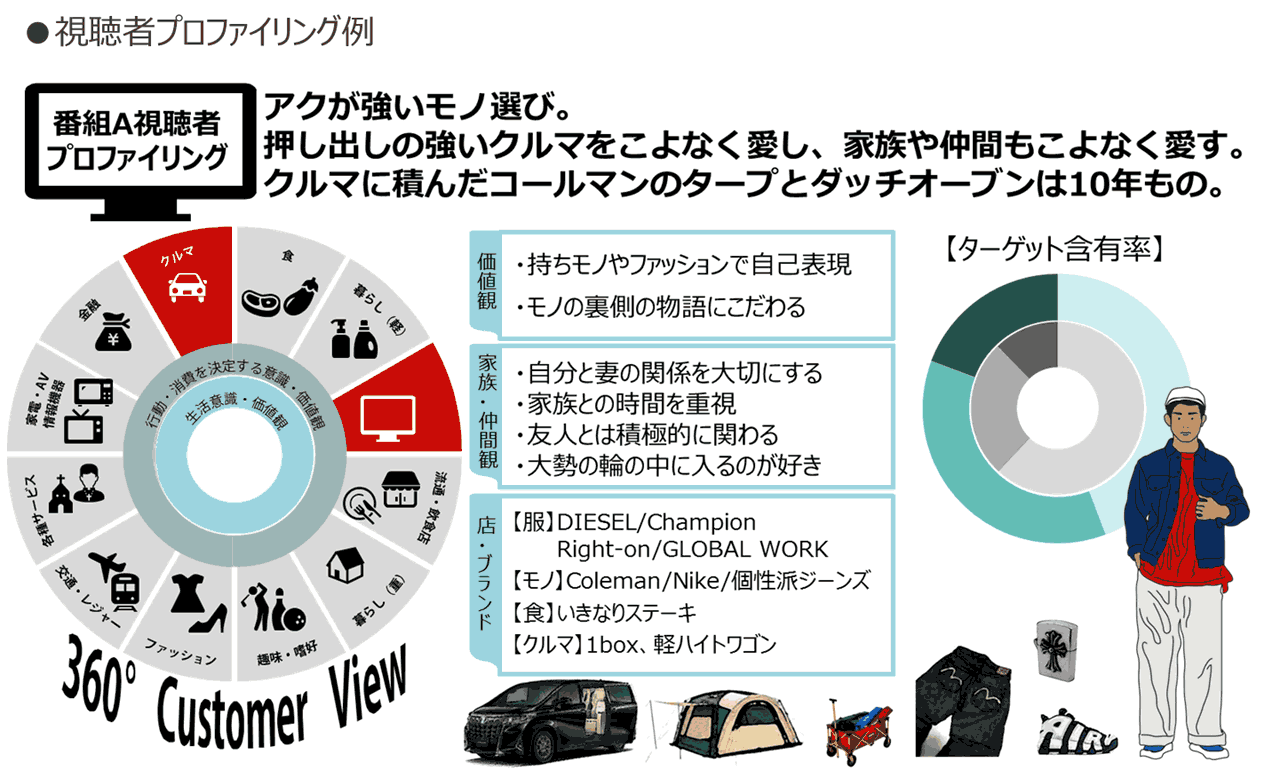 詳細な属性設定はもとより、実際の商品購入やサービス利用状況、生活意識・価値観を加味したターゲット設定など、リッチな付帯情報を駆使して視聴者像を分析するサービスもその1つです。