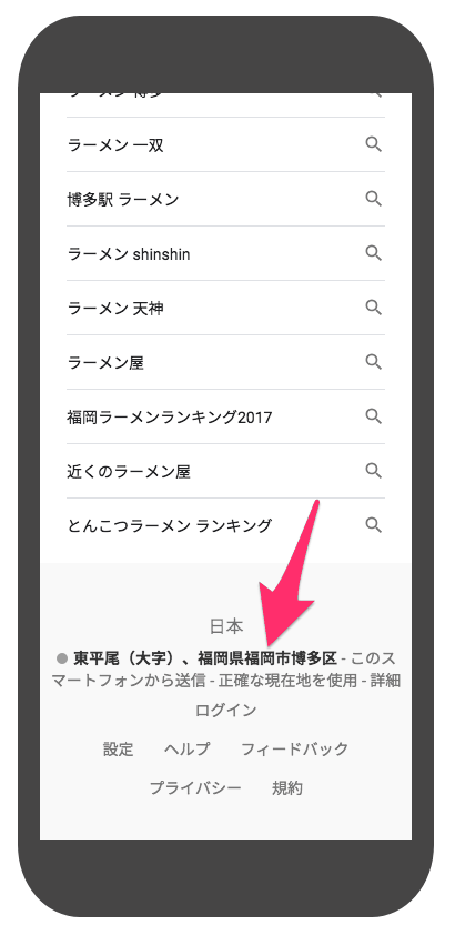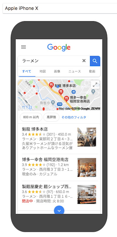東京からでも、福岡でiPhoneを使って「ラーメン」を検索した場合のモバイル検索結果を調べられた!