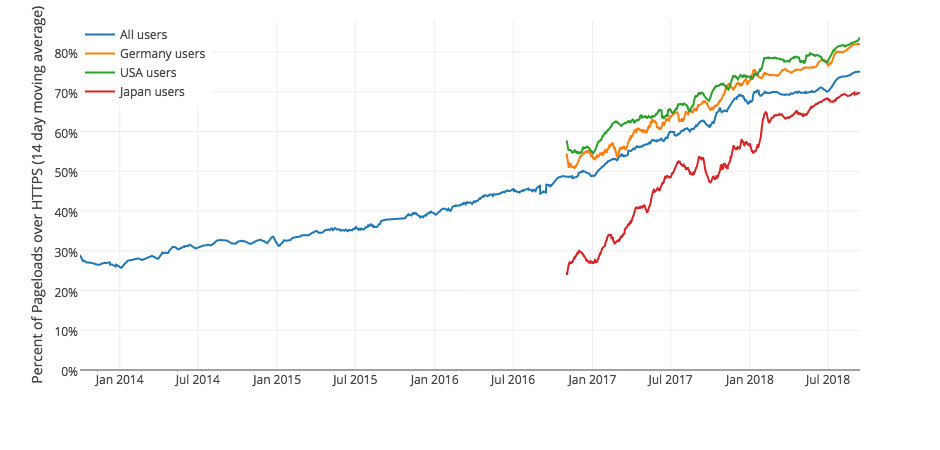 FirefoxとChromeのデータから見て取れるように、ウェブでは今やHTTPSが大勢を占めている。その割合を今後もさらに増やしていくだろう。
