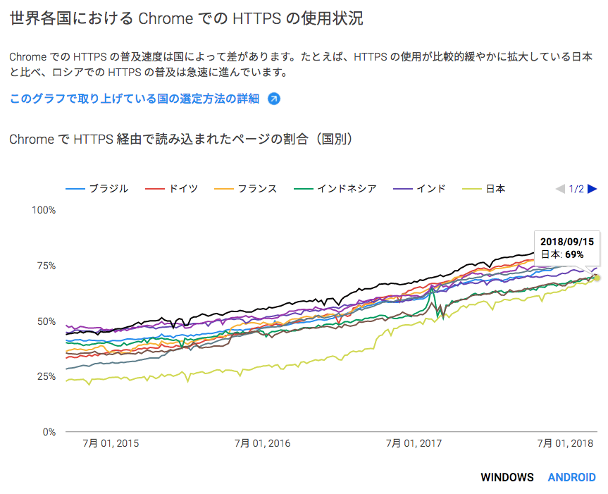 なお、ChromeがHTTPS経由で読み込んだページの率は透明性レポートでグーグルが公開している。9月15日の時点では日本は Firefox と同じく70%に近い値となっている(Windows版Chromeのデータ)。