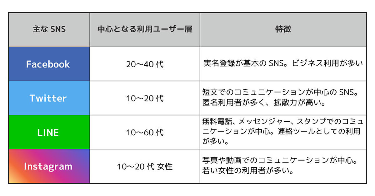 ターゲット層が多く利用するSNSを選択しないことには、何らかの反応が得られにくいよね。そのためには、どのSNSがどのように利用されているのか、しっかりを知ることが大事なんだ。