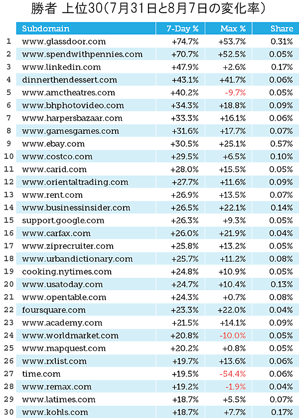 最初の2つの列を比較すると、すぐに目に入るのはVerywell Health(7位)だ。このサイトは7日の間に52.3%減少したが、7月の最低値からは200%強も増加した。このサイトのSERPシェアは7月の第1週には非常に低い値で推移していたのが、その後、急激に上昇している。興味深いことに、Verywell Family(2位)とVerywell Fit(11位)も敗者の上位30サイトに挙がっており、ここに特別な事情があることを示唆している。