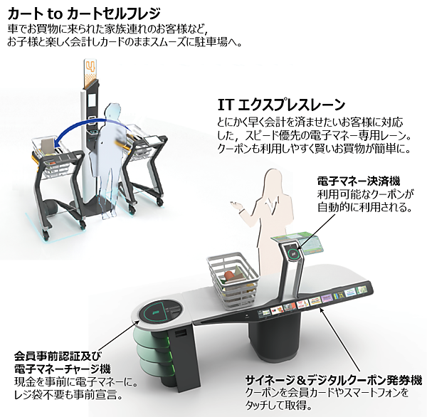 「カートtoカートセルフレジ」が家族連れ向きのレジで、「ITエクスプレスレーン」が忙しいお母さん向きのレジ。
