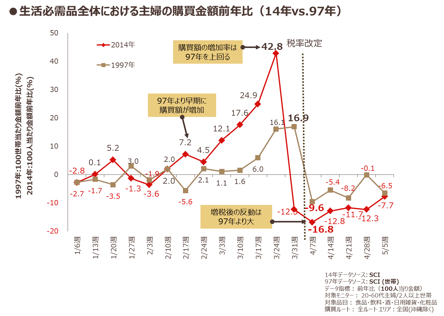 まず、1997年の増税(消費税3%→5%)直前週の生活必需品(飲食料品・雑貨・化粧品)の購買額は、前年と比較して16.9%増加しました。これに対して、2014年の増税直前週の購買額は対前年42.8%の増加と、1997年の増税時を大きく上回りました(図表2)。