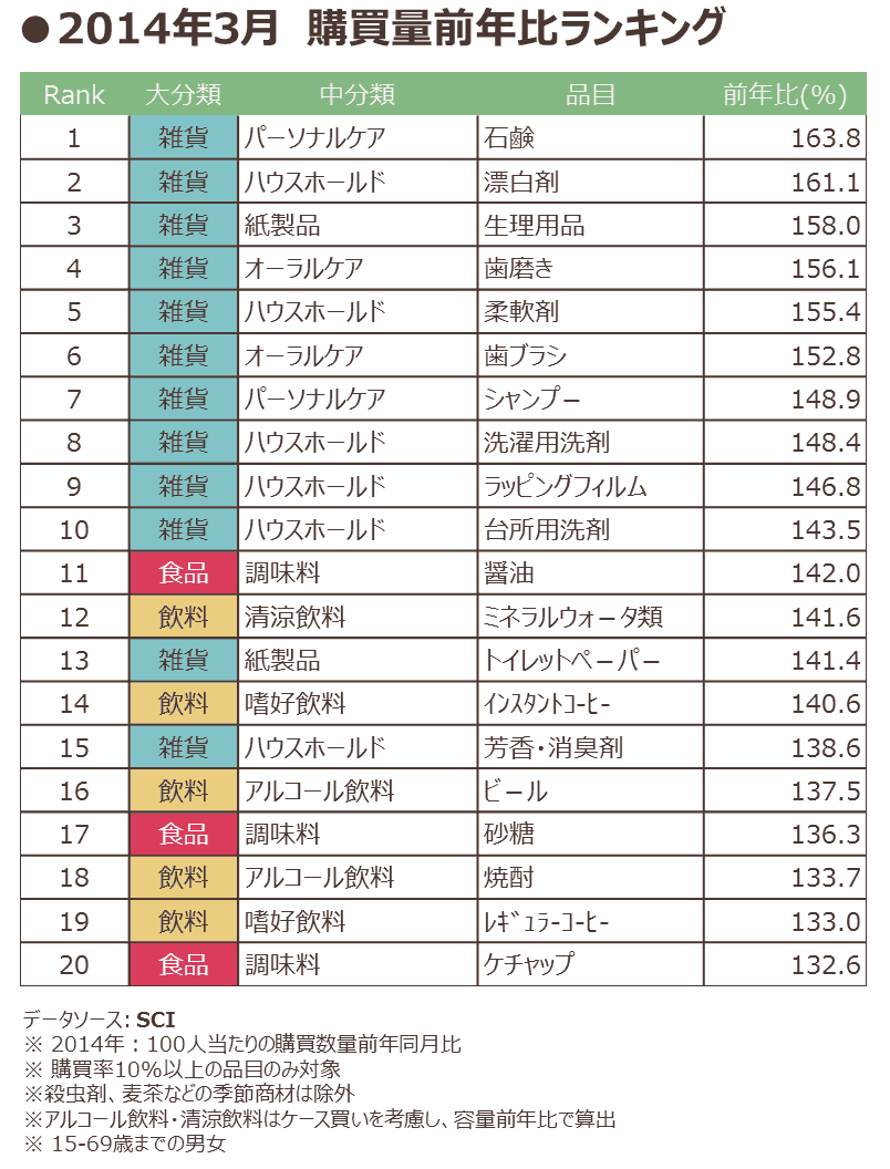 2014年の増税時は、特に日用雑貨品の購買量が伸びています。図表3は、購買量の前年比が高い順にカテゴリーを並べたものです。比較的長期のストックが可能なものが多く、上位には日用雑貨品が集中し、次に調味料や飲料が続いていました。