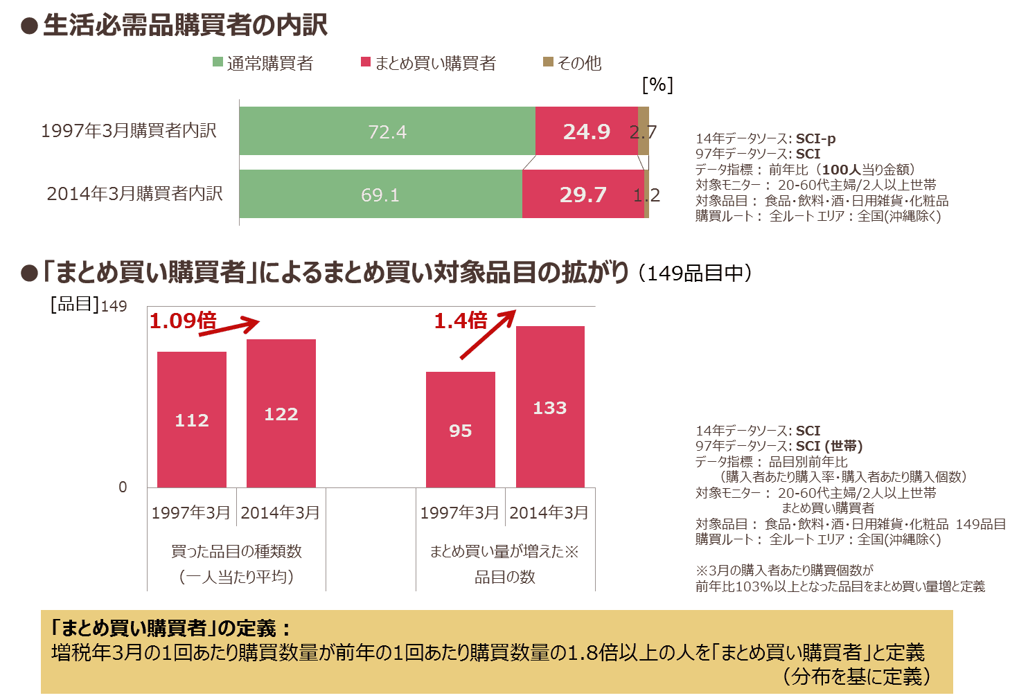 このまとめ買いをした人たちは、3月に1人当たり平均122品目を買っていました。1997年の112品目から1.09倍と、買うものの「幅」を広げていたことになります。また、1つひとつの品目でもまとめて買う量を増やしていて、133品目で前年より買う量が増えていました。これも、1997年の95品目から1.4倍と、買うものそれぞれの「まとめ買い量」を増やしていたことになります。