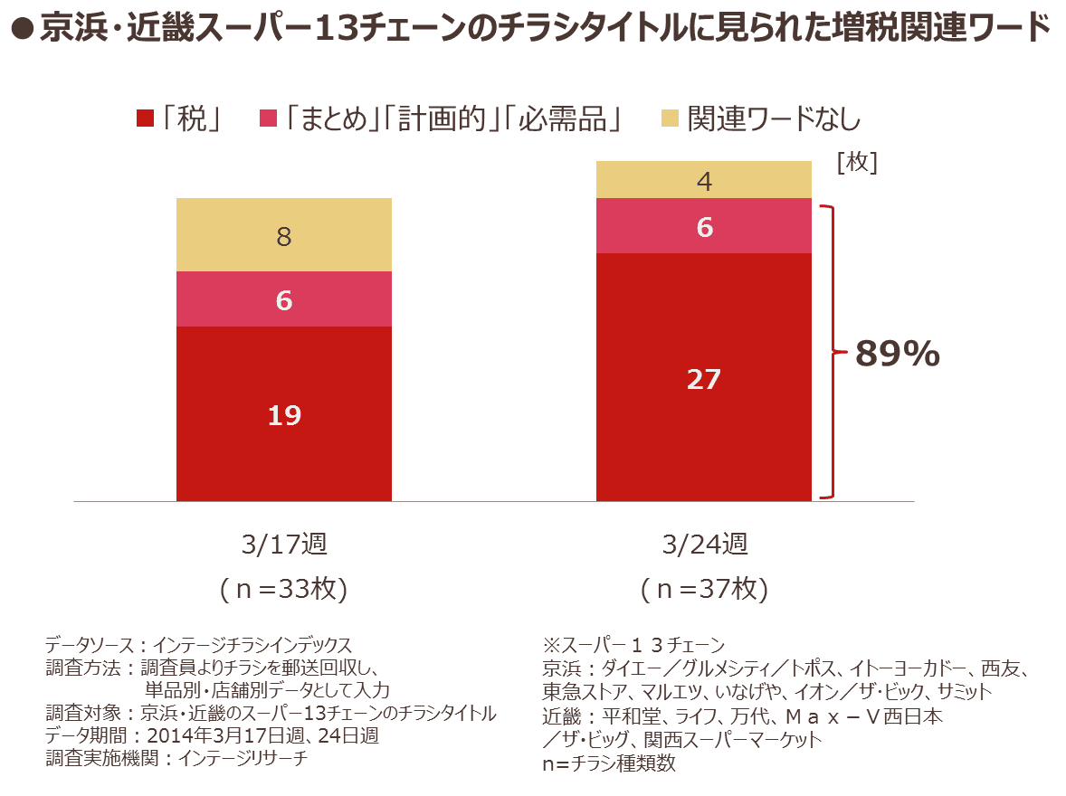 すると、増税直前の週に発行されたチラシの89%に「税」「まとめ」といった文言が入り、ほとんどのチラシに何らかの増税関連ワードが掲載されていました(図表5)。