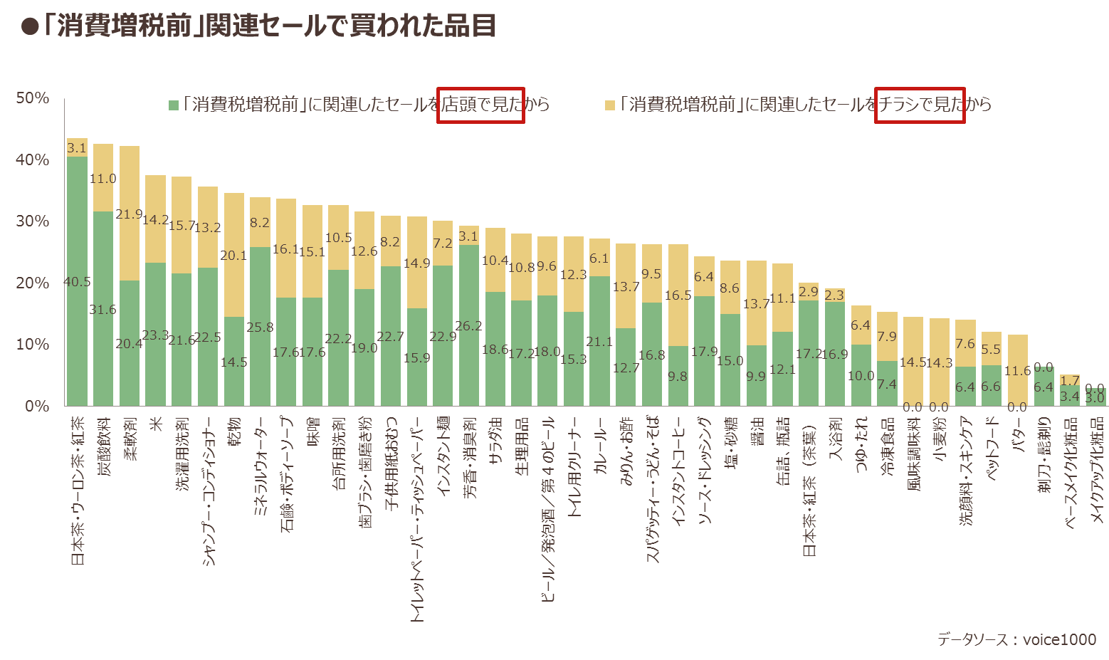 特に清涼飲料や炭酸飲料などの飲料系は店頭セールによってまとめ買いが促進され、柔軟剤や洗濯用洗剤などの日用雑貨やまとめ買いセールが多い乾物などは、チラシでも促進されたことがわかります。