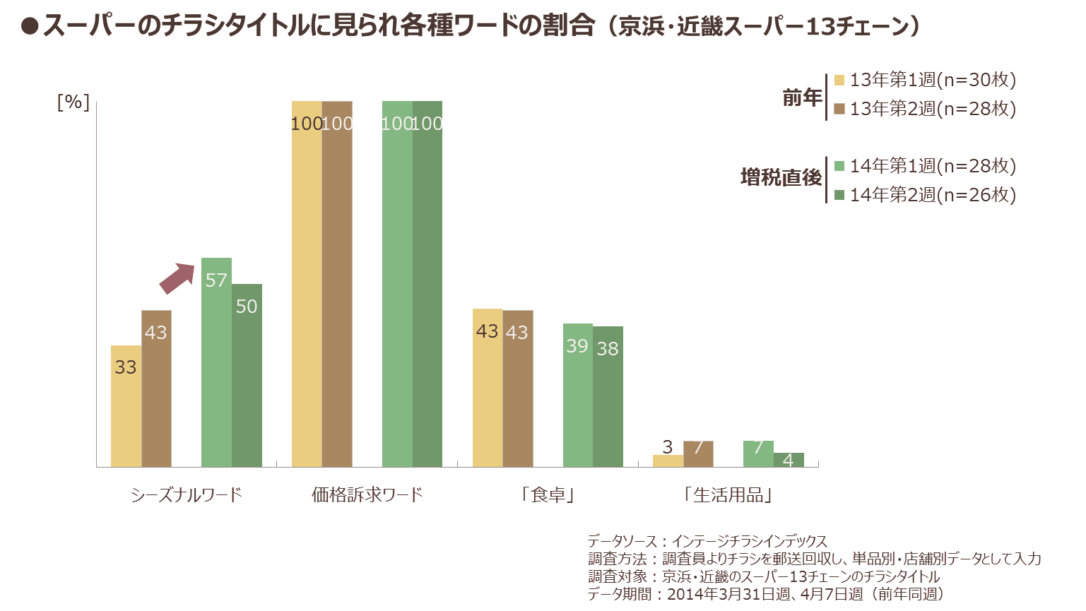 価格を訴求するワードは、増税前の2013年のすべてのチラシでも使われていましたが、増税直後も同様にすべてのチラシで使われていました。ここで使われていた価格訴求ワードは「価格据え置き」「価格引き下げ」といったもの。増税による消費者負担を抑える工夫が見られます。また、前年と比べて「お花見」「行楽」「新学期」といった季節イベントに関するワードが増えていました。季節イベントを訴求することで、来店を促す工夫をしていた様子がうかがえます。