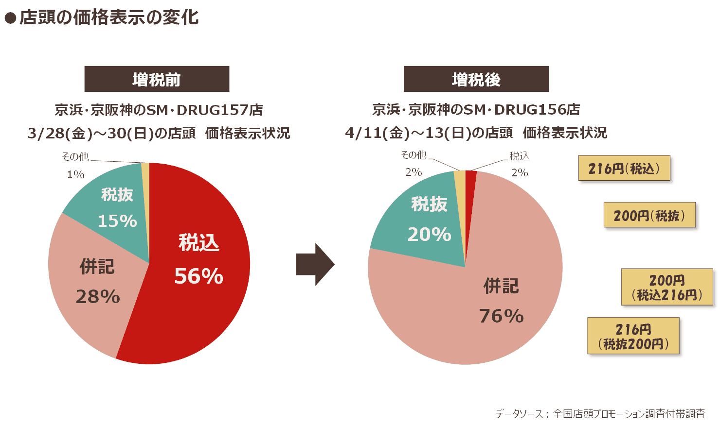 次に、「買い物をする場所」である店頭で目にする「価格表示の仕方」に注目してみます。1997年の消費増税の後、2004年に商品の価格を税込みで表示する「総額表示」が小売店に義務付けられました、さらに2014年の増税にともって、「税込み・税抜き」価格を併記して表示可能になりました。