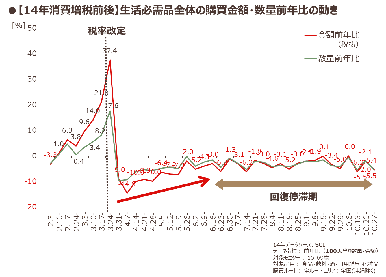 2014年の消費増税は引き上げ幅が3%と、1997年の増税より大きかったことや、マスコミや店頭でもまとめ買いを促進する動きが目立ったことで、生活者の購買意欲が強くかき立てられ、駆け込みでの消費が増えたといえそうです。