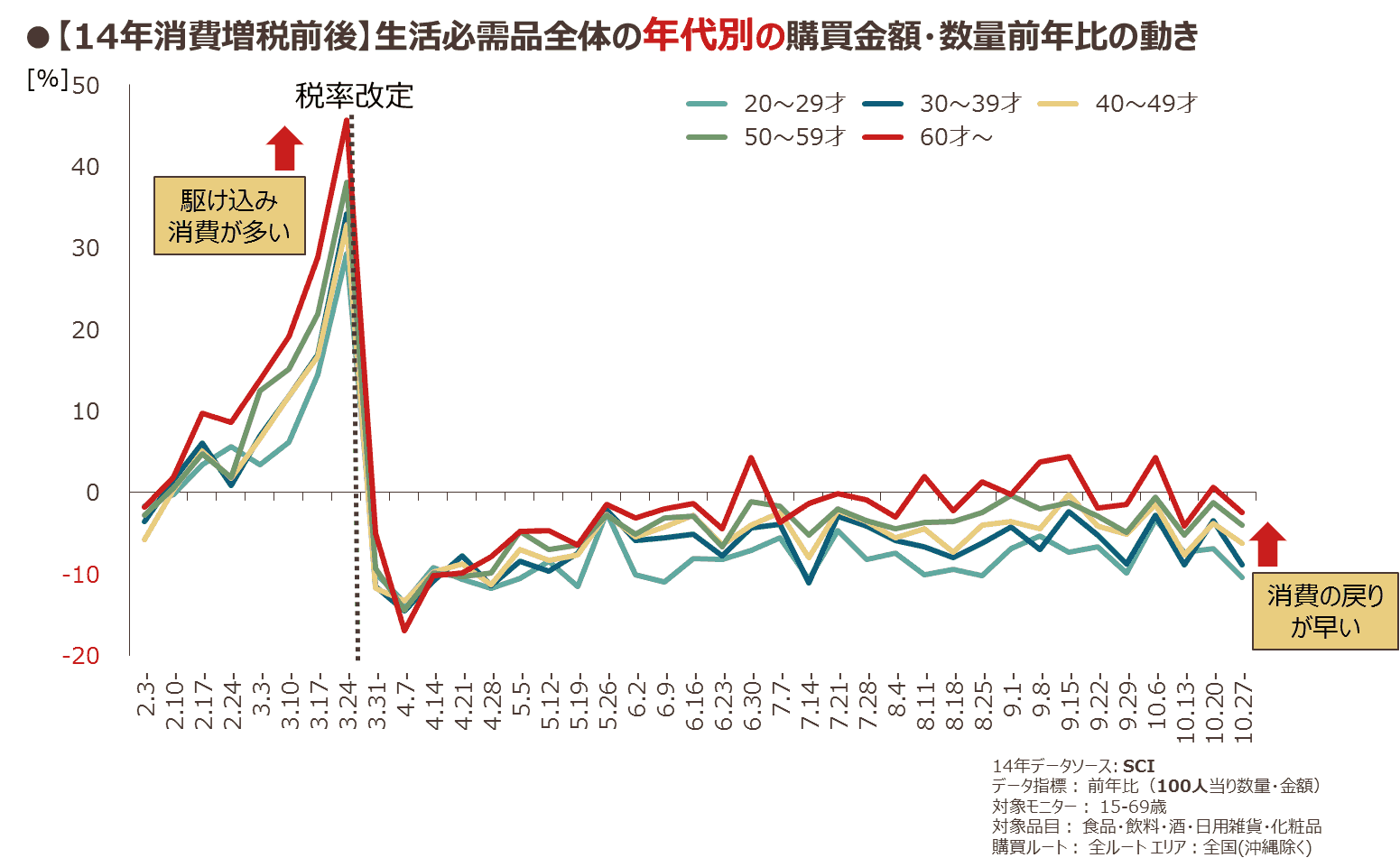 このデータを生活者の年代で比較すると、年代が上になるほど直前の駆け込み消費が多く、消費の回復が早い傾向が見られました(図表10)。