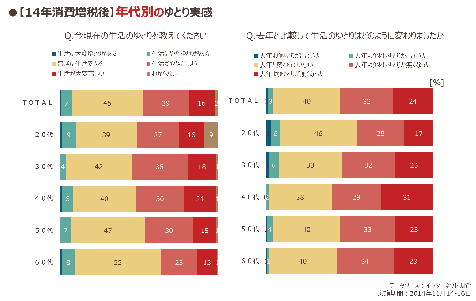 まず、生活者の心理にどのような変化があったのかを振り返ります。増税から半年経った2014年11月の時点で、「去年と比較して生活のゆとりがなくなった」人は全体で56%と半数を超えていました。特に子育て世代である40代に多く、30~40代では生活が苦しいと感じる人も多くなっています(図表11)。