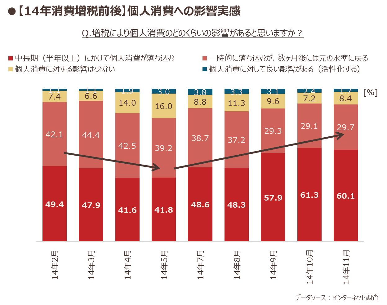 また、「増税によって中長期にかけて個人消費が落ち込む」と感じる人が、増税直後の4~5月は42%程度でしたが、時間を追うごとに徐々に増加して11月には60%に達し、じわじわと負担を実感してきた様子がうかがえます(図表12)。
